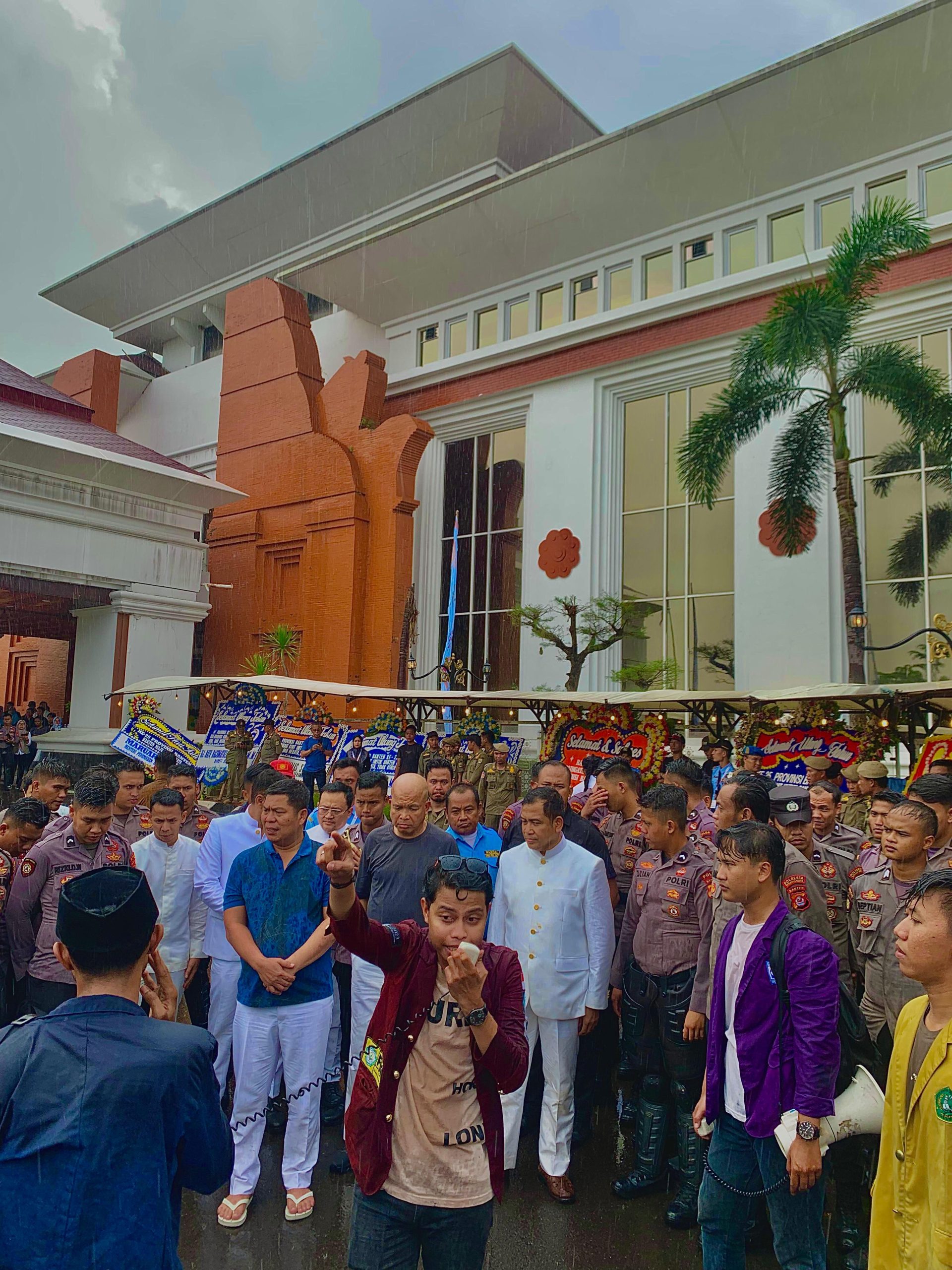 Meski diguyur hujan deras, para mahasiswa tetap bersemangat menyuarakan aspirasi rakyat dan menyerukan evaluasi terhadap berbagai kebijakan pemerintah daerah.