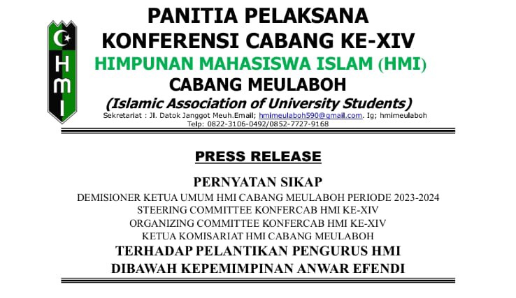Tintaindonesia.id, Meulaboh — Koordinator Steering Committee Konferensi Cabang (KONFERCAB Ke-XIV) HMI Cabang Meulaboh beserta Panitia Pelaksana KONFERCAB dan Ketua Komisariat Se-HMI Cabang Meulaboh menolak penyelenggaraan pelantikan HMI cabang Meulaboh periode 2025-2026 oleh PB HMI yang akan dilaksanakan pada 15 November 2025 di Aula Bappeda Aceh Barat karna dinilai Inkonstitusional dalam menetapkan saudara Anwar Efendi sebagai formatur.