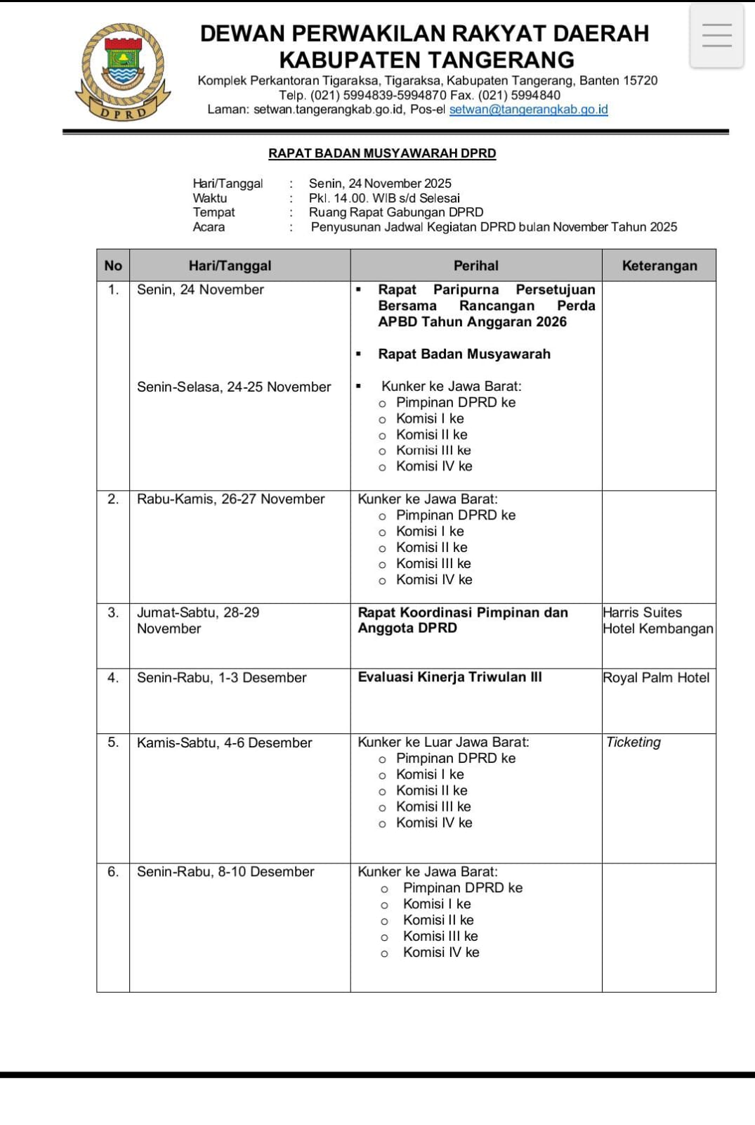 Tintaindonesia.id, Tangerang — Maraknya kunjungan kerja DPRD Kabupaten Tangerang ke luar kota patut mendapatkan sorotan dan kritik serius. Di tengah kompleksnya persoalan yang dihadapi masyarakat Kabupaten Tangerang mulai dari pemerataan pembangunan, kurangnya kondusifitas infrastruktur di beberapa wilayah, pelayanan publik yang belum optimal, hingga persoalan ekonomi masyarakat para wakil rakyat justru lebih sering melakukan perjalanan dinas ke luar daerah, Senin (22/12/2025).