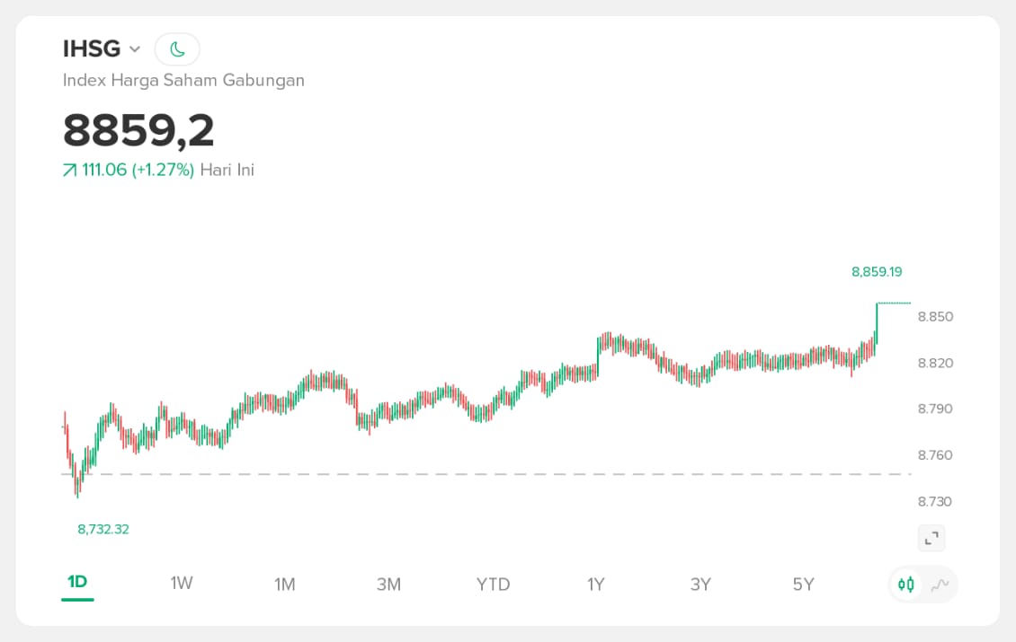 Tintaindonesia.id, Jakarta – Indeks Harga Saham Gabungan (IHSG) mencatatkan penguatan signifikan pada perdagangan hari ini. IHSG ditutup di level 8.859,2, naik 111,06 poin atau 1,27 persen, mencerminkan sentimen positif pelaku pasar terhadap kondisi pasar saham domestik, Senin (5/1/2026).