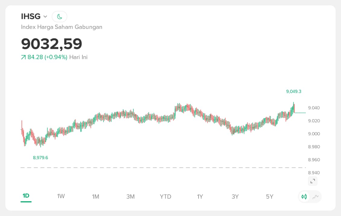 Secara teknikal, pergerakan IHSG hari ini membentuk pola kenaikan bertahap (higher low) setelah sebelumnya sempat menyentuh area terendah di kisaran 8.979. Momentum ini mengindikasikan adanya minat beli yang cukup kuat di level support, sekaligus menandakan optimisme pasar terhadap prospek jangka pendek.