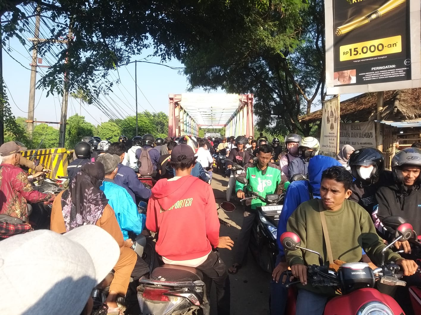 Pantauan disekitar lokasi hanya terpasang spanduk himbauan untuk kendaraan bertonase berat dilarang melintas di jembatan tersebut. Dampaknya kemacetan terurai hingga puluhan kilo meter.